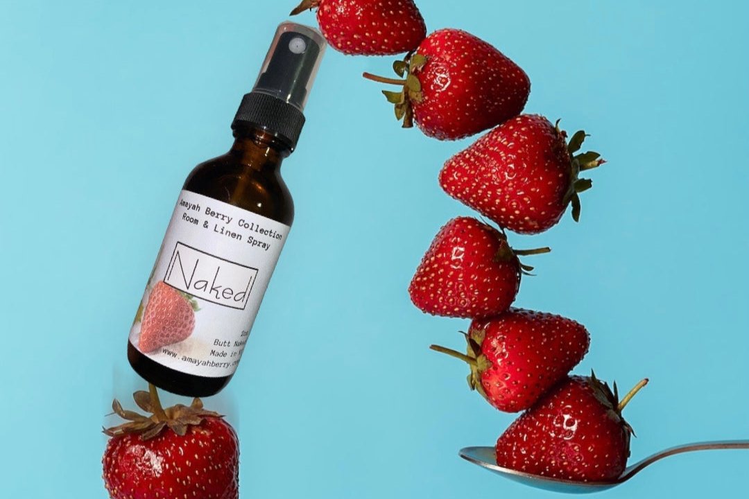 Amayah Berry Collection Room Spray, Butt Naked; is made up of a fruity bouquet with strawberry, banana, peach and melon top notes with sweet lactony background.
